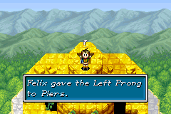 Go north and go west. Use Move to push the wooden pillar away. Now go all the way back to the staircase. Head west and go north. Stand on the sand and use Sand. You can now reach the treasure chest. Go all the way back to the staircase then all the way to the corridor where the path splits to the wooden pillar. This time head east and enter the next room.