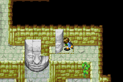 Here follow the corridor. Use Whirlwind on the first bush. Enter the room and go north. Push the pillar away and climb down. Jump across and get the treasure. Go back and exit the room. Go west and down a staircase. In floor 2, follow the long corridor into the next room. Go north in the next room and push the statue piece into place. The statue's eyes will become green. Now, go all the way back until you reach the staircase that brings you back to floor 2 middle. Now follow the corridor so it leads you into the sand room again. Keep following the path and use Sand when needed. After you use Sand, go south and take the staircase.